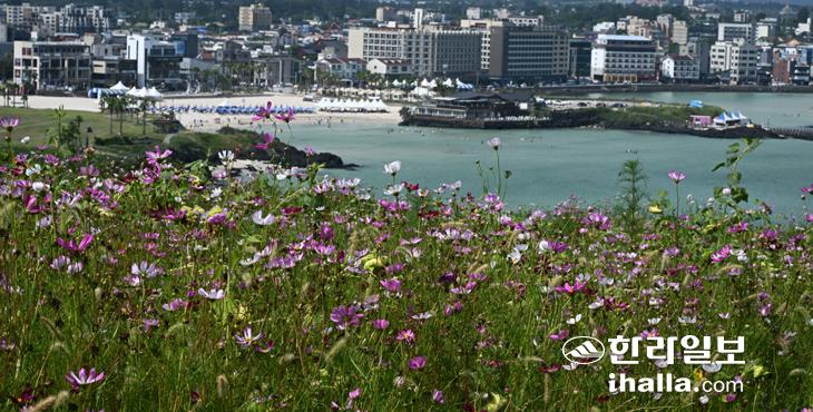 [한라일보] 5일 제주시 조천읍 함덕리 서우봉에 활짝 핀 가을 코스모스 너머로 여름 해수욕장이 어우러지며 시선을 사로잡고 있다. 강희만기자