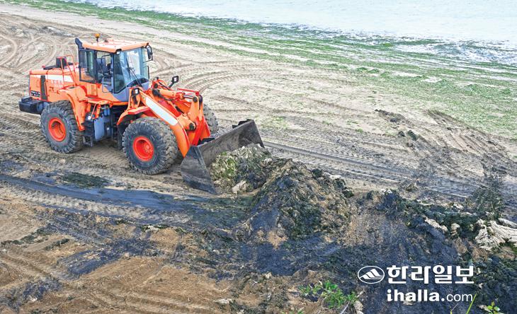 [한라일보] 5일 서귀포시 성산읍 오조리 해안에서 중장비를 이용한 파래 수거 작업이 이뤄지고 있다. 강희만기자