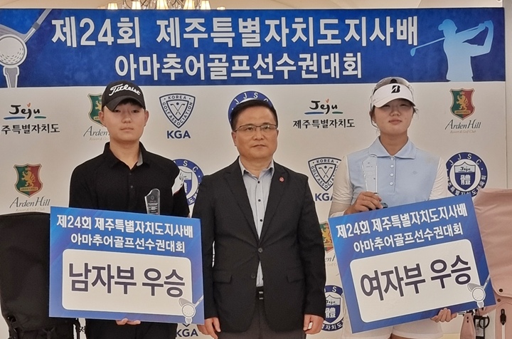 제24회 제주특별자치도지사배 아마추어골프선수권 우승자인 김로건(왼쪽)과 유아현(오른쪽). 제주자치도골프협회 제공