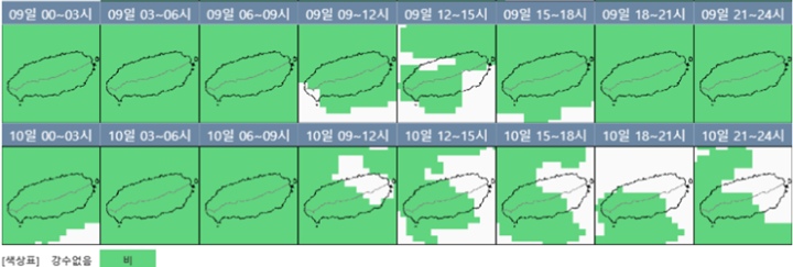 제주지방기상청에 따르면 제주지방은 8일부터 제주도 남쪽 해상에 위치한 정체전선의 영향을 받아 11일까지 강풍을 동반한 비가 내릴 것으로 예상된다. 이번 비는 8일 낮동안 소강상태를 보이다 밤부터 시작돼 8일까지 산지와 한라산 남쪽지역을 중심으로 내리겠다. 휴일인 10일 새벽부터 오전사이에 산지를 중심으로 돌풍과 함께 시간당 20~30㎜의 강한 비가 내리는 곳도 있겠다.
