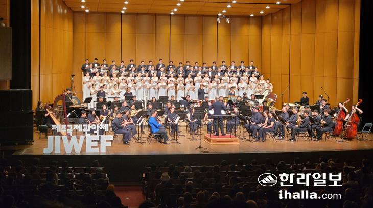 지난 8일 제주아트센터에서 열린 2025제주국제관악제 여름시즌 개막공연에서 140여명 규모의 제주도립서귀포관악단과 도립 제주·서귀포합창단이 광복 80주년을 기념해 우효원 작곡의 '아! 대한민국' 연주를 선보이고 있다. 박소정기자