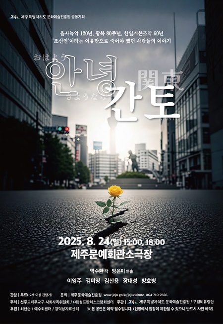 광복 80주년을 기념해 선보이는 이번 연극은 1923년 관동대지진 이후 일본 간토 지역에서 발생한 조선인 학살의 비극적 역사를 무대에 되살린 작품이다. 도 문화예술진흥원과 천주교 제주교구 사회사목위원회, 재단법인 성프란치스코평화센터, 구럼비유랑단이 함께 이번 공연을 준비했다.