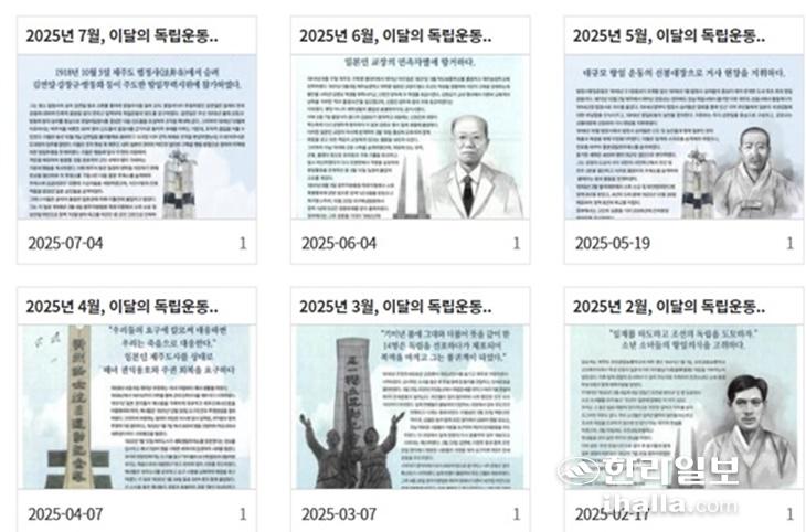 [한라일보] 광복 80주년을 맞아 제주도가 도내외에서 다양한 기념사업을 이어가고 있는데 정작 '이달의 제주 독립운동가'를 알리는 홍보 활동에는 소극적인 것으로 나타났다. 제주도 보훈청, 항일기념관 홈페이지 내 '이달의 제주 독립운동가' 홍보물을 뒤늦게 게시하는 사례가 적지 않아서다.