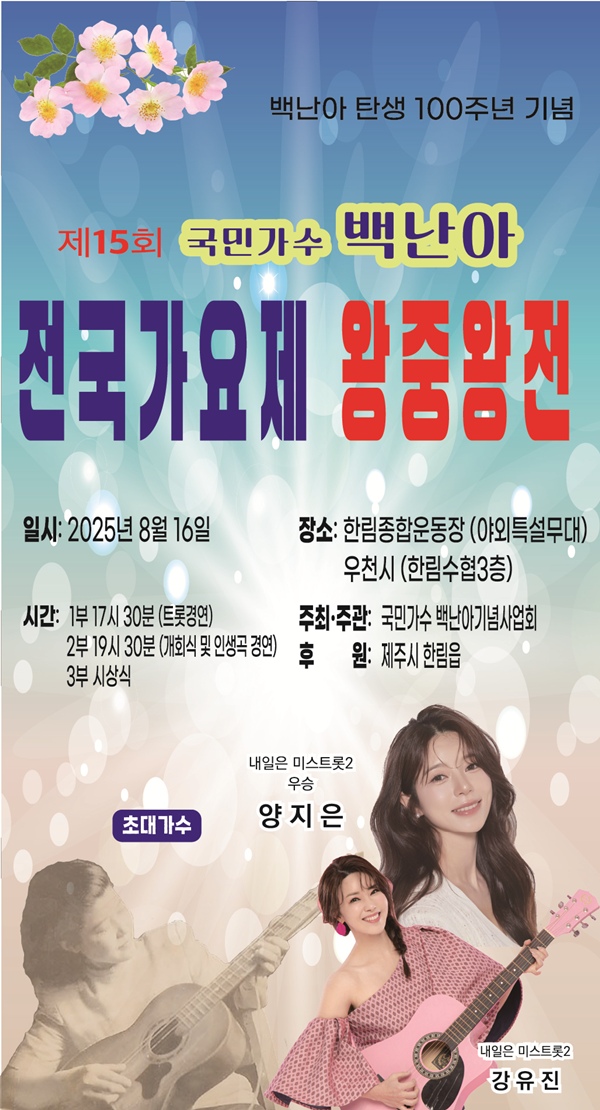 [한라일보] 올해로 15회를 맞는 국민가수 백난아가요제 역대 수상자들이 한데 모는 왕중왕전이 펼쳐질 예정이어서 눈길을 끌고 있다.