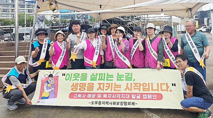 제주시 도두동지역사회보장협의체(공동위원장 좌윤철·성애라)는 지난 9일 도두 썸머리워터페스티벌 행사장 내에서 고독사 예방 및 복지사각지대 발굴 캠페인을 실시했다.