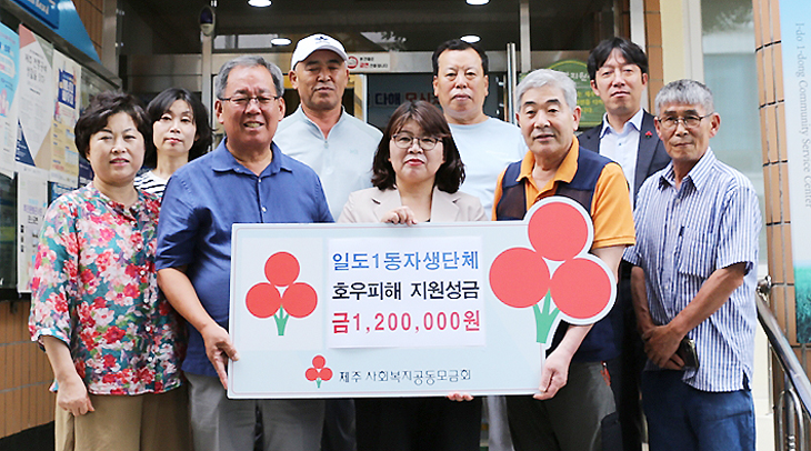 제주시 일도1동 자생단체 일동은 지난 8일, 일도1동사무소에서 호우피해 지원성금 120만원을 제주사회복지공동모금회(회장 강지언)에 기탁했다.