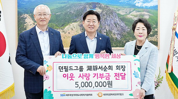 [한라일보] 서순희 던필드그룹 회장은 12일 제주도청에서 고향사랑기부금 1000만원과 취약계층 지원 기부금 500만원 등 총 1500만원을 기부했다.