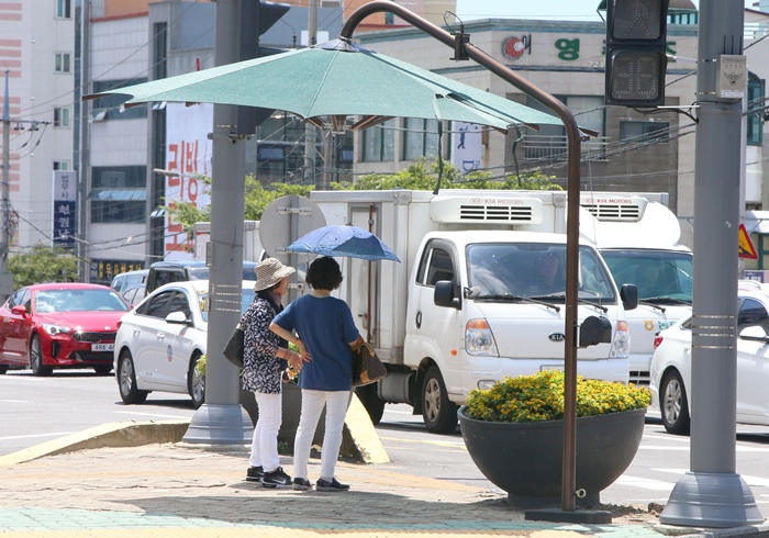 거리 그늘막에서 잠시 더위 피하는 시민들. 한라일보DB