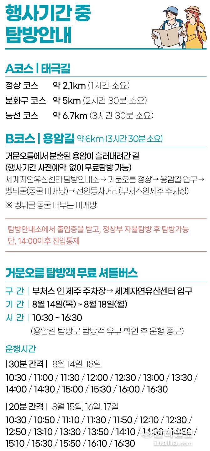 거문오름에서 분출한 용암이 흘러간 길을 따라 걷는 용암길 코스는 이번 행사 기간 중에만 개방된다. 세계자연유산센터 탐방안내소에서 출발해 거문오름 정상, 용암길 입구, 벵뒤굴, 선인동사거리까지 이어지는 6㎞·3시간 30분 코스로 해설사와 함께 오르면 평소에 볼 수 없었던 거문오름의 숨은 매력을 맛볼 수 있다.