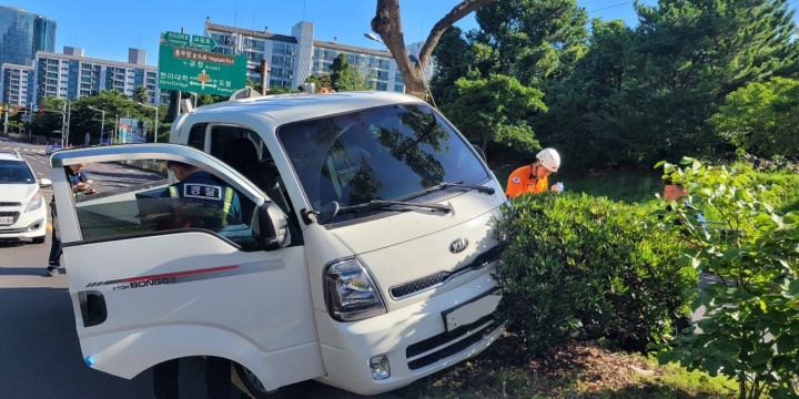 14일 오전 8시 32분쯤 제주시 노형동의 한 도로에서 트럭이 중앙 화단 위에 올라타 있다는 행인의 신고가 접수됐다. 제주소방안전본부 제공