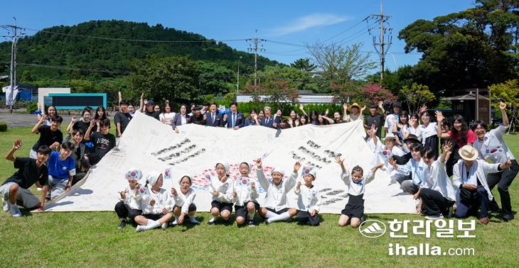 15일 제주아트센터 정문에서 진행된 제80주년 광복절 퍼포먼스가 끝난 뒤 기념촬영을 하고 있다. 제주도 제공