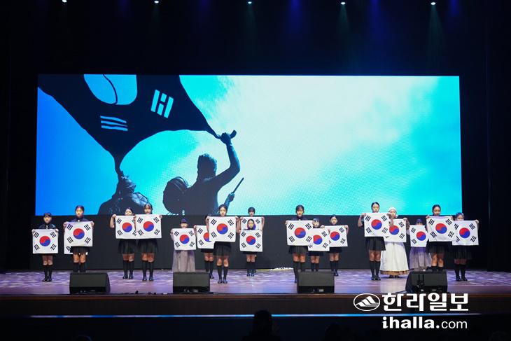 15일 제주아트센터에서 열린 80주년 광복절 경축식에서 '항일운동을 통해 내일로 나아간다' 주제 뮤지컬 공연이 열리고 있다. 제주도 제공