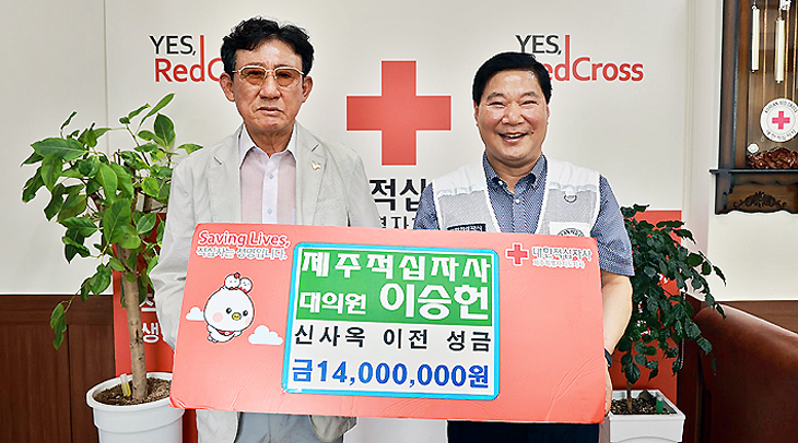 이승헌 제주적십자사 대의원이 대한적십자사 제주특별자치도지사(회장 정태근)를 최근 방문해 신사옥 이전과 제2 인재개발원 유치를 위한 성금 1400만원을 전달했다.