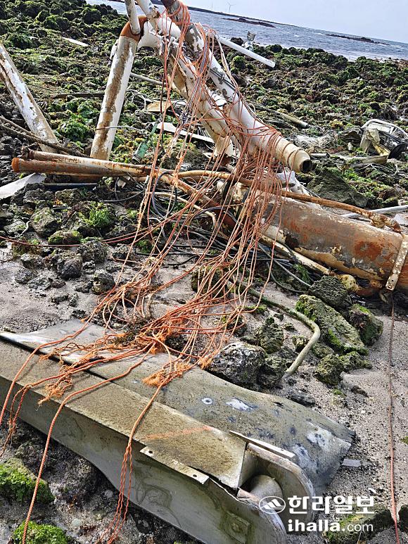 21일 오전 제주시 구좌읍 하도리의 토끼섬 연안에는 선박 잔해물과 엔진기관 등 다양한 해양쓰레기들이 널려 있었다.