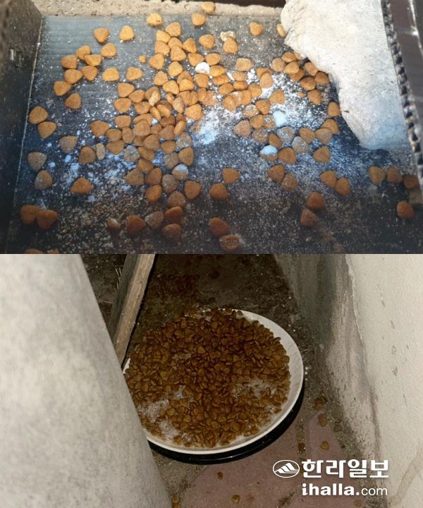 최근 제주시 삼양동의 길고양이 급식소에서는 수상한 파란 가루가 사료에 섞이거나 락스 냄새가 진동하는 등 동물학대 정황이 발견됐다. 한달 새 고양이 2마리가 의문사하기도 했다. 독자 제공