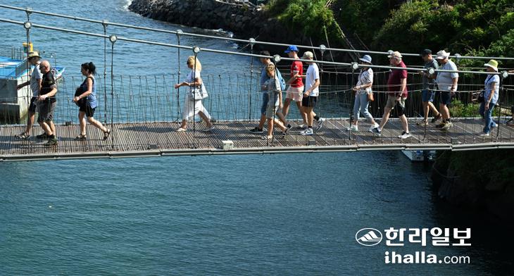 [한라일보] 26일 제주시 용담동 용연구름다리를 찾은 외국인관광객들이 다리를 건너고 있다. 강희만기자