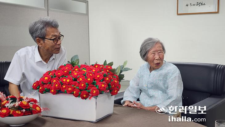 지난 26일 홍을생 어르신이 제주4·3평화재단에 손뜨개 동백꽃을 기증했다. 제주4·3평화재단 제공