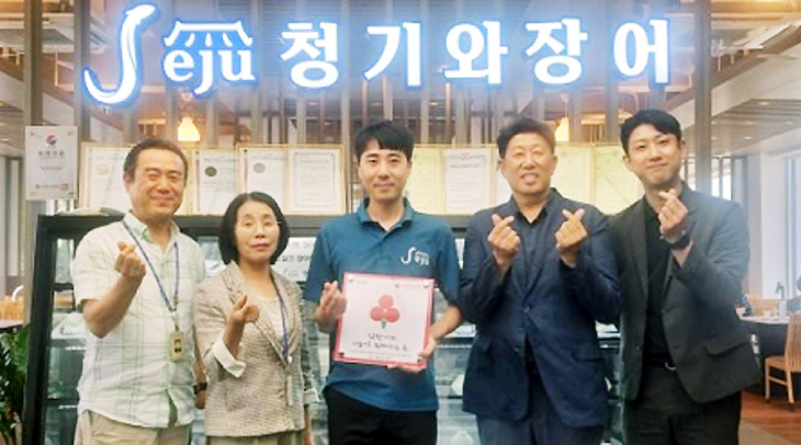 제주청기와장어(대표 한정훈)는 최근 제주사회복지공동모금회(회장 강지언)와 중문동지역사회보장협의체(공동위원장 임정순·고창보)가 진행하는 '착한가게 캠페인'에 동참하고 현판 전달식을 가졌다. 제주청기와장어는 매월 수익의 일부를 기탁하게 됐다.