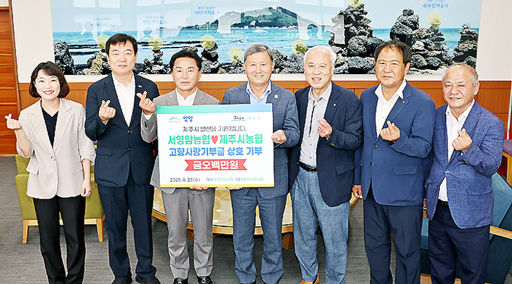 제주시농협(조합장 고봉주)과 전라남도 서영암농협(조합장 김원식)은 27일 제주시장 집무실에서 고향사랑기부금 상호 기탁식을 가졌다.