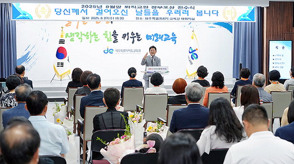 [한라일보] 제주특별자치도교육청은 27일 본청 대회의실에서 '2025년 8월 말 퇴직교원 정부포상 전수식'을 열었다.