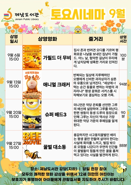 [한라일보] 제남도서관이 내달부터 오는 12월까지 '토요시네마'를 운영한다.