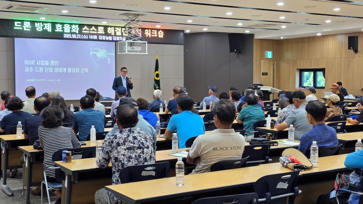 스스로해결단은 27일 대정농협 대회의실에서 '드론 방제 효율화(행정안전부 공감e 가득사업)' 제4차 워크숍을 개최했다. 이번 행사에는 제주도청, 농업기술센터, 지역 농민 등 60여 명이 참석했다.