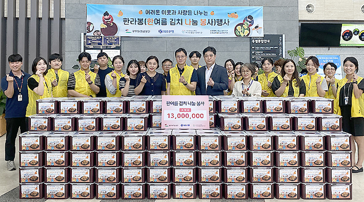 공무원연금공단(이사장 김동극)은 지난달 28일 취약 계층을 위한 '한라봉(한여름 김치 나눔 봉사)' 활동으로 서귀포시 내 저소득 어르신 300가구에 김치를 전달했다.