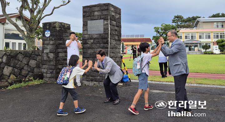 1일 제주시 구좌읍 평대초등학교에서 김광수 제주도교육감과 고길철 평대초 교장이 새 학기 아이들을 맞이하고 있다.
