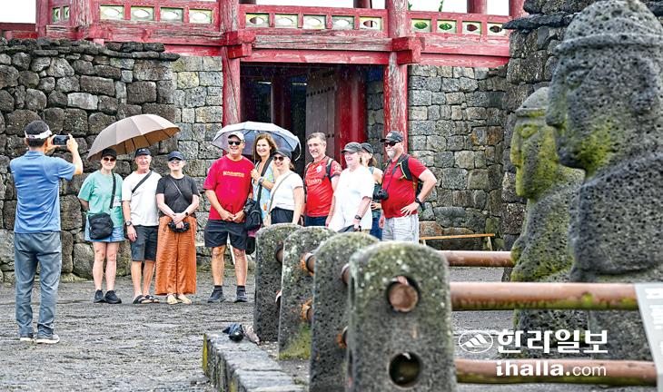 [한라일보] 1일 서귀포시 표선면 성읍민속마을을 찾은 외국인 관광객들이 기념촬영을 하고 있다. 강희만기자