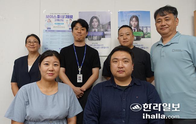지난달 27일 발생한 보이스피싱 피해 사건을 막은 제주동부경찰서 형사 8팀 소속 서보성 경장(아래에서 오른쪽)과 김연희 순경(아래에서 왼쪽)과 형사들.