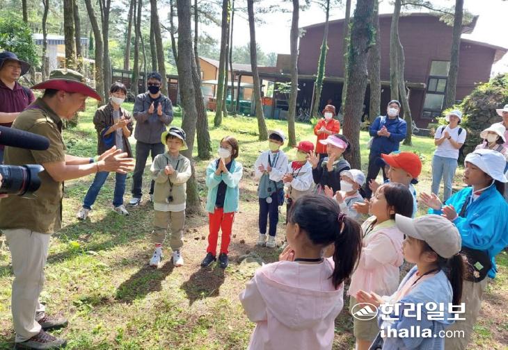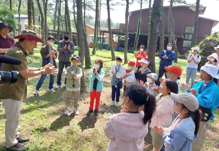 어린이를 대상으로 숲속에서 생태교육 중인 왕준호 대표. 왕준호 대표 제공