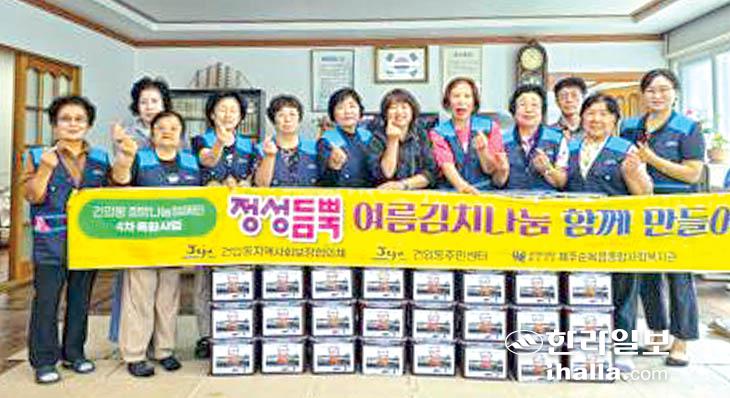 제주시 건입동지역사회보장협의체(공동위원장 김영숙·김미성)는 지난 3일 순복음종합사회복지관(관장 조영숙)과 함께 '정성 듬뿍 여름 김치 나눔행사'를 진행했다. 이날 직접 담근 김치를 건입동 내 취약계층 80가구에 직접 전달했다.