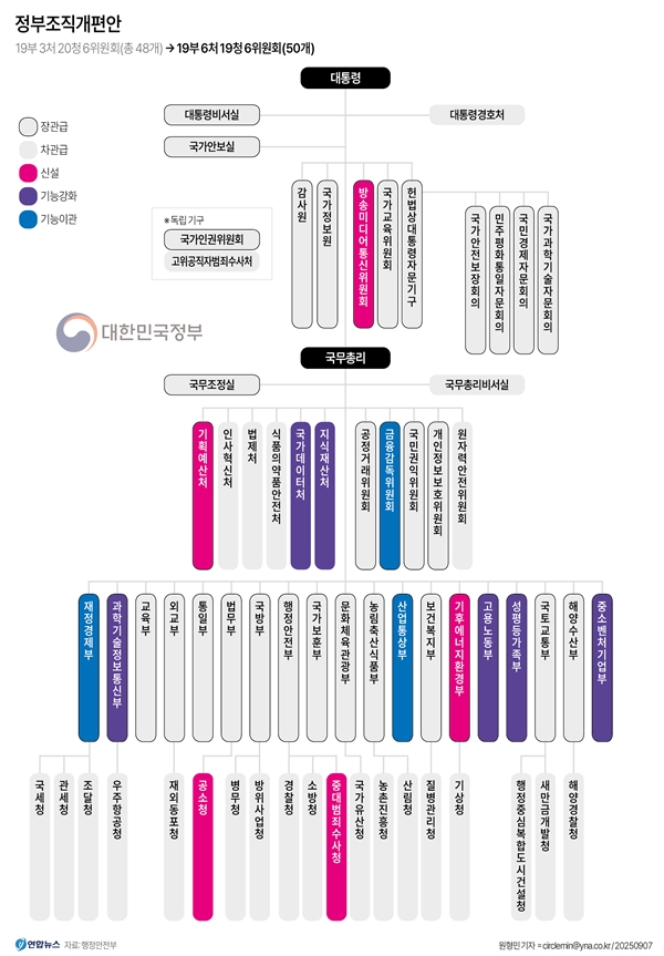 이번 조직개편안에 따라 정부 조직은 현재 '19부 3처 20청 6위원회'에서 '19부 6처 19청 6위원회'으로 바뀌게 됐다.