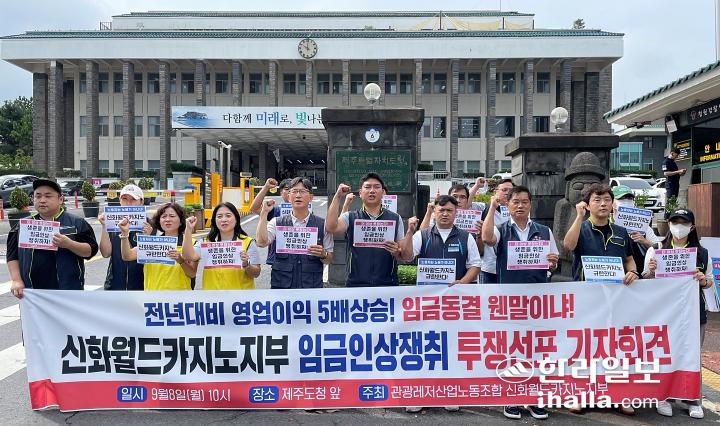 관광레저산업노동조합 신화월드카지노지부는 8일 오전 10시쯤 제주도청 앞에서 ‘임금인상쟁취 투쟁선포’ 기자회견을 열었다.