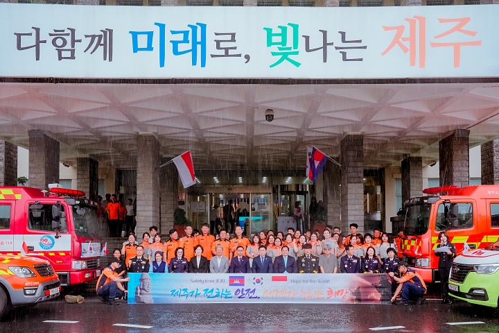 제주특별자치도는 8일 오전 도청 탐라홀에서 ‘글로벌 안전 나눔 소방차량 출정식’을 열었다. 제주특별자치도 제공