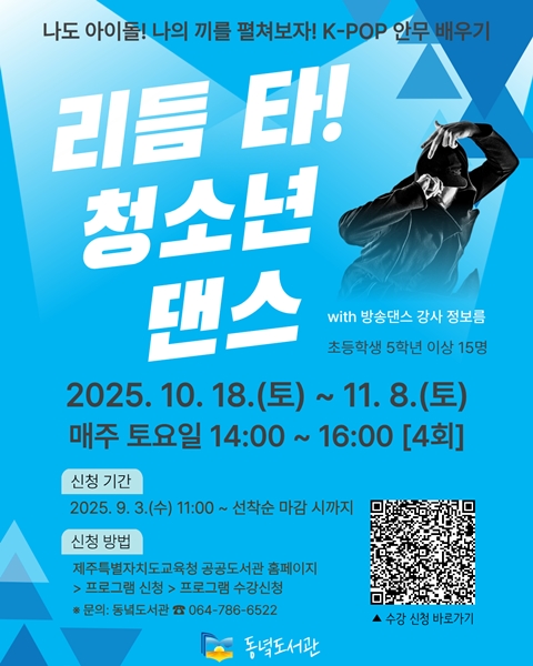 [한라일보] 동녁도서관이 내달 18일부터 오는 11월 8일까지 '2025년 리듬 타! 청소년 댄스'를 운영한다.
