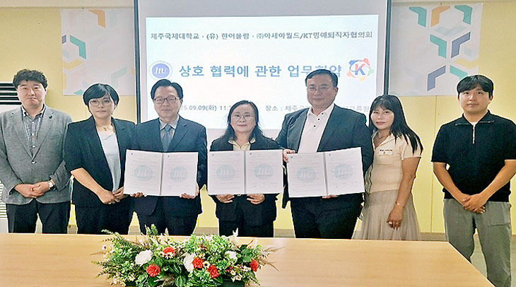 제주국제대학교는 9일 대학 국제교류원에서 (유)한어울림, (주)아세아월드/KT명예퇴직자협의회와 상호협력을 통해 스마트팜 전문인력개발을 위한 공동사업을 진행하기 위한 업무협약(MOU)을 체결했다.