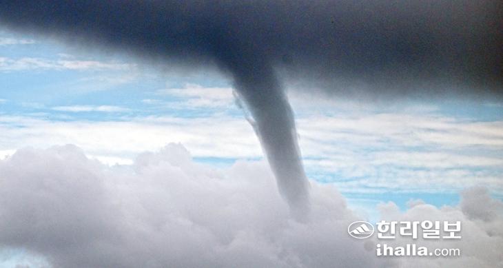[한라일보] 9일 오전 제주시 한경면 고산리에서 바라본 중산간 상공에 용오름 현상이 관찰됐다. 용오름은 지표면 가까이에서 부는 바람과 비교적 높은 상공에서 부는 바람이 서로 방향이 달라 발생하는 기류현상으로 소용돌이 바람이다. 강희만기자