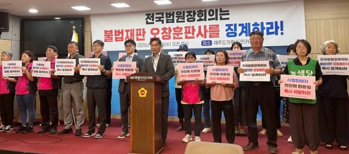 공안탄압저지 및 민주수호 제주대책위원회는 10일 오전 제주도의회 도민카페에서 기자회견을 열고 “전국법원장회의는 제주지법 불법재판 A판사를 징계하라”고 요구했다. 대책위 제공