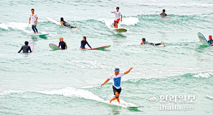 [한라일보] 10일 제주시 구좌읍 월정리해수욕장에 많은 서퍼들이 찾아 파도타기를 즐기고 있다. 강희만기자