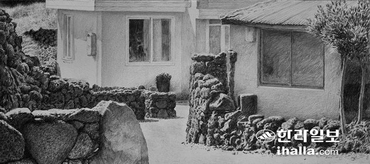 해안도로를 걸어가다가 만난 옛모습 그대로의 취락구조를 바라보며 돌담을 쌓으면서 이웃의 동선을 먼저 고려하는 품성이 느껴지니 감동하지 않을 수 없었다. 저 모습이 신산리사람들의 '살아온 정'이라고 생각하여 오래된 흑백사진의 느낌을 줄 수 있도록 연필 한 자루를 들고 모든 채도를 빼고서 명도만 가지고 내리쬐는 눈부신 광선을 묘사하게 된 것이다.