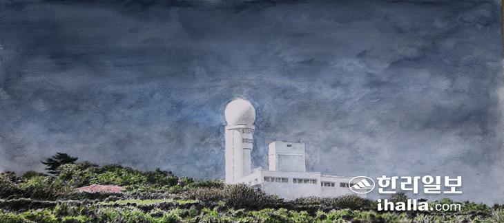 그날은 이랬다. 마을 풍경을 그리기 위해 돌아다니던 날, 온통 먹구름이 드리운 하늘이 상징하는 것은 신산리가 처한 제2공항 문제라는 생각이 들 정도. 구름 사이로 햇살이 내리 비치자 기상레이더 건물이 하얗게 빛났다. 문득, 함축적으로 흘러나온 독백이 있어 그리기 시작. '저 하늘은 비행기의 것인가?!' 저 건물의 기능과 목적은 하늘의 조화를 관찰하고 알리는 것이다. 물질문명에 의하여 인간의 편리함이 생성되었다고 할지언정 하늘이 스스로 움직이는 것을 막거나 제어 할 수는 없는 것.