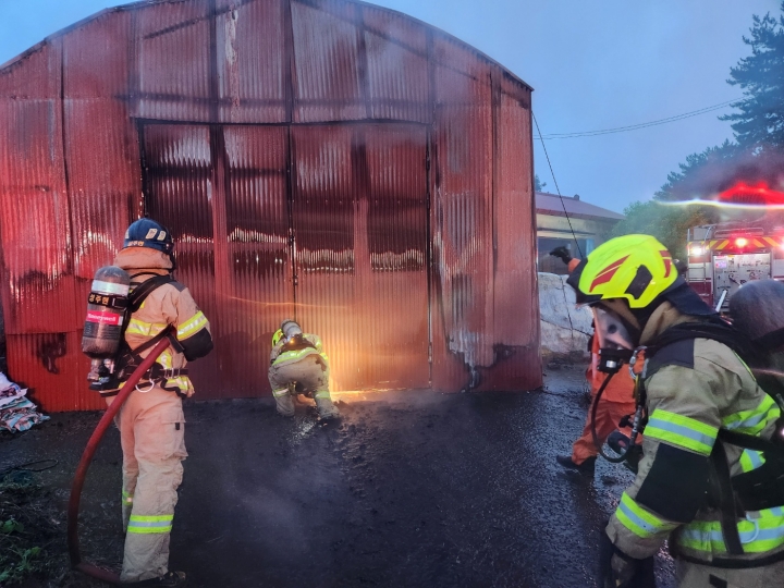 12일 오전 5시 46분쯤 서귀포시 성산읍 신풍리에서 낙뢰로 인해 창고 화재가 발생했다. 제주소방안전본부 제공