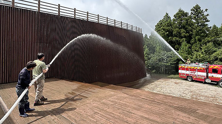 이날 훈련은 절물생태관리소 자위소방대원 32명이 참여, 옥외 소화전을 이용한 초기 진압과 신속한 인명 대피 유도 상황 등을 점검했다.