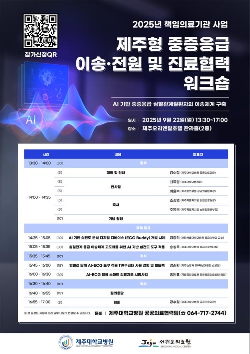 제주대학교병원과 서귀포의료원이 오는 22일 제주오리엔탈호텔 한라홀에서 'AI기반 중증응급 심혈관계 질환자의 이송체계 구축'을 주제로 워크숍을 개최한다.