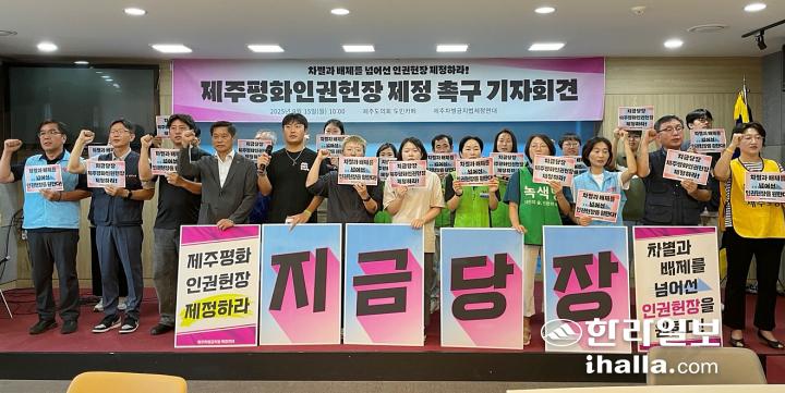 단체는 “인권헌장 제정은 도민 화합과 평화로운 제주를 위한 오영훈 도정의 핵심 공약”이라며 “일부 극우·보수 기독교 세력의 방해로 여전히 난항을 겪고 있지만 이 헌장은 세계인권선언과 대한민국 헌법 등 국내외 인권 규범을 토대로 완성된 평화와 인권의 약속”이라고 강조했다.