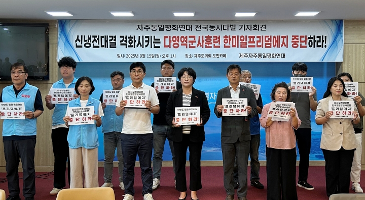 제주자주통일평화연대는 15일 오후 제주도의회 도민카페에서 기자회견을 열고 한미일 다영역군사훈련 한미일 프리덤 에지 중단을 촉구했다.