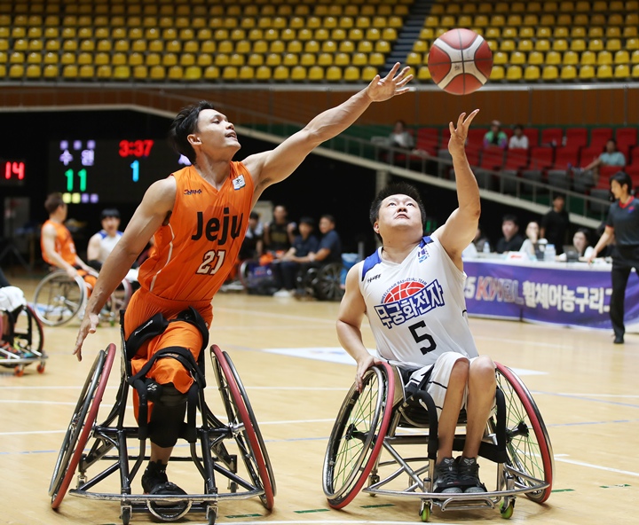 [한라일보] 제주특별자치도휠체어농구단이 안방에서 승률 5할을 맞췄다.