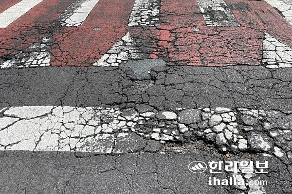 [한라일보] 제주도내 곳곳에서 발생하는 포트홀(도로 파손으로 생긴 움푹 파인 구멍)이 운전자들의 안전을 위협하고 있다. 또 최근 기후위기 등으로 예측 불가능한 소나기가 자주 발생하면서 노후화된 도로 위 포트홀 발생에 대한 우려가 커지고 있다.