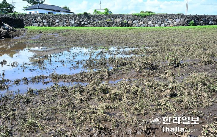 [한라일보] 16일 제주시 구좌읍 행원리 한 당근밭에 밤사이 쏟아진 빗물이 들어차 있다. 강희만기자